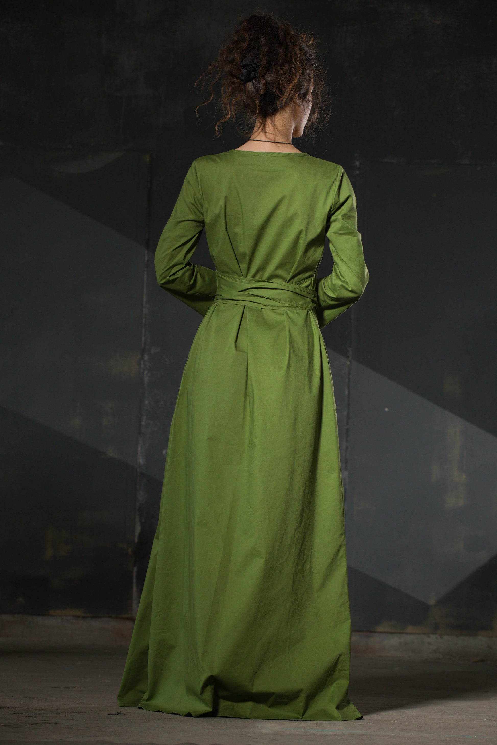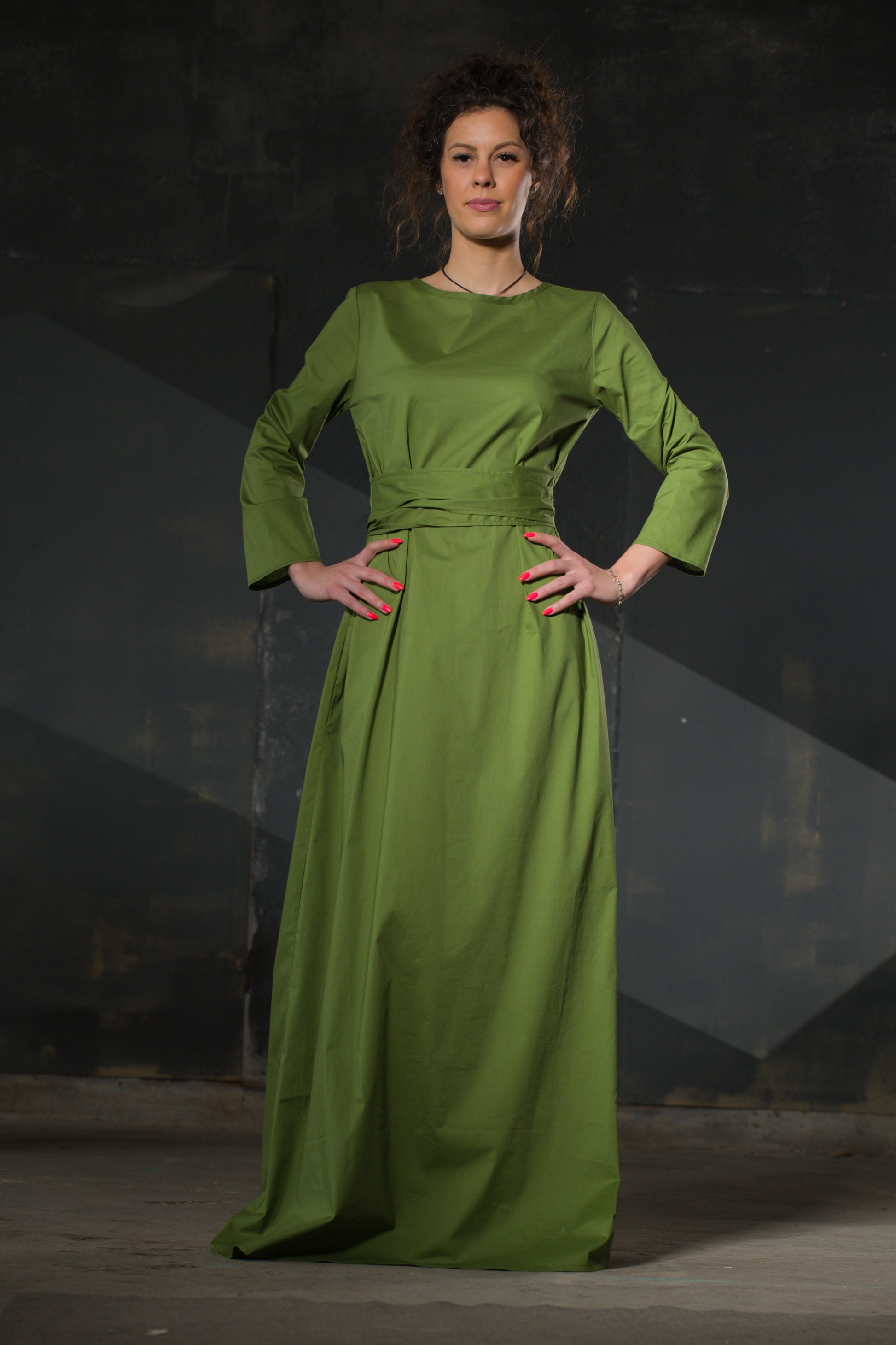 Clean lines interrupted only by the bow at the waist. Olive green — the colour of old maps and Sunday mornings. Long sleeves, full length, side pockets. A dress that requires nothing of you except to wear it well.