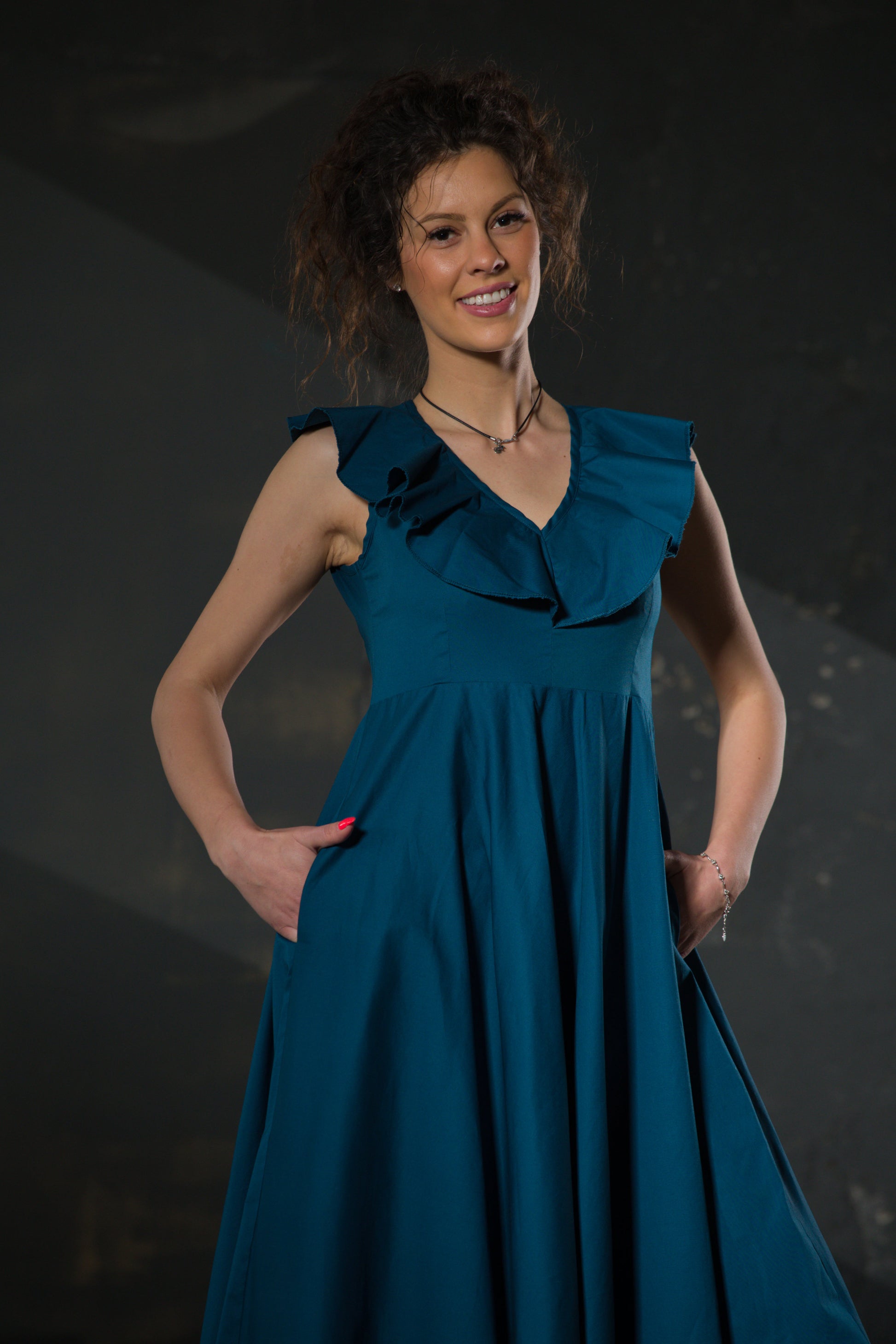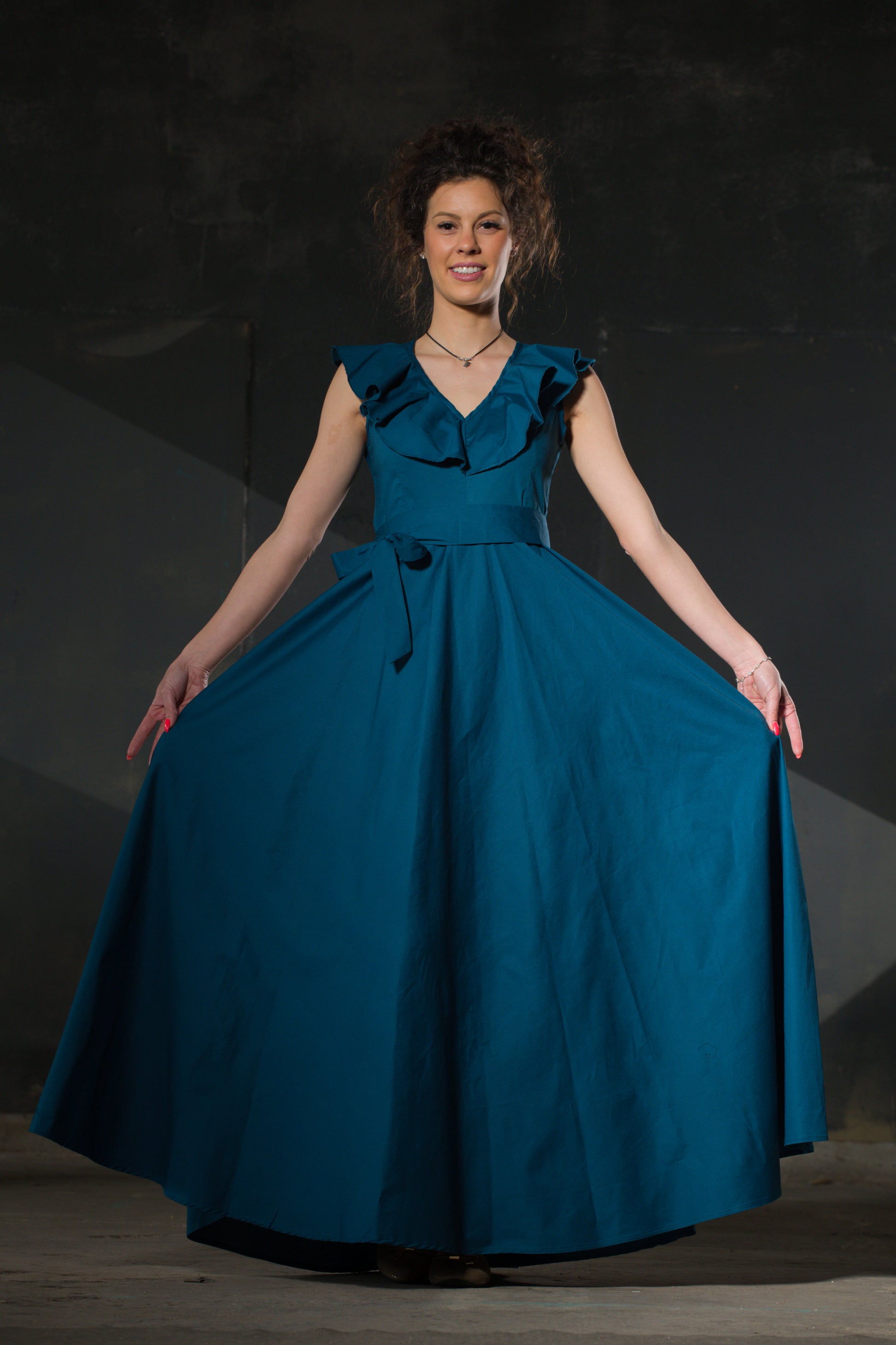 The ruffles at the shoulder are not decoration — they are movement made permanent. Teal, deep and oceanic, in a full skirt that sweeps the floor when you walk. A bow at the waist lets you decide the silhouette. This is the dress for the dinner you have been putting off.