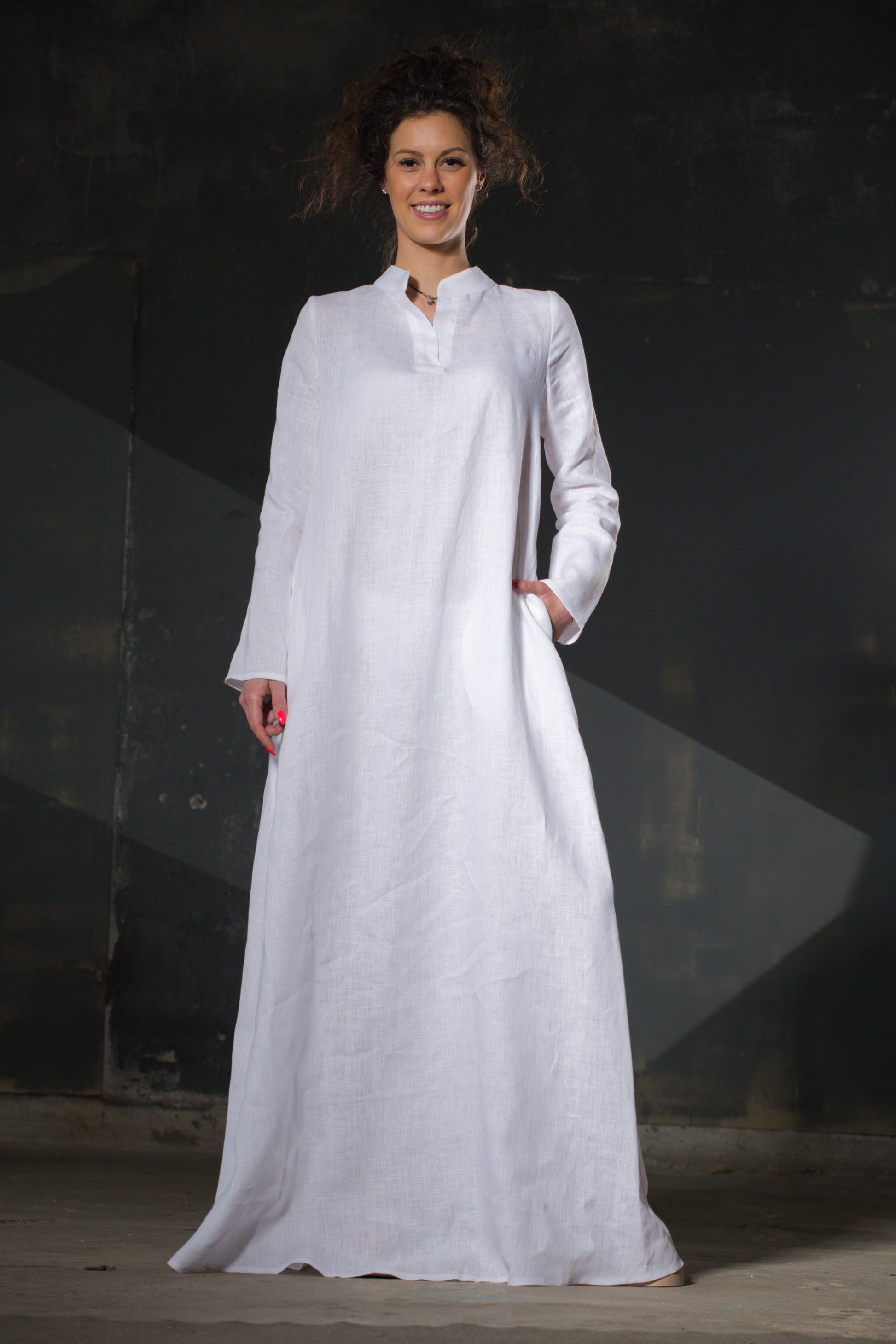 White Linen Maxi Dress — Mandarin Collar, Long Sleeve