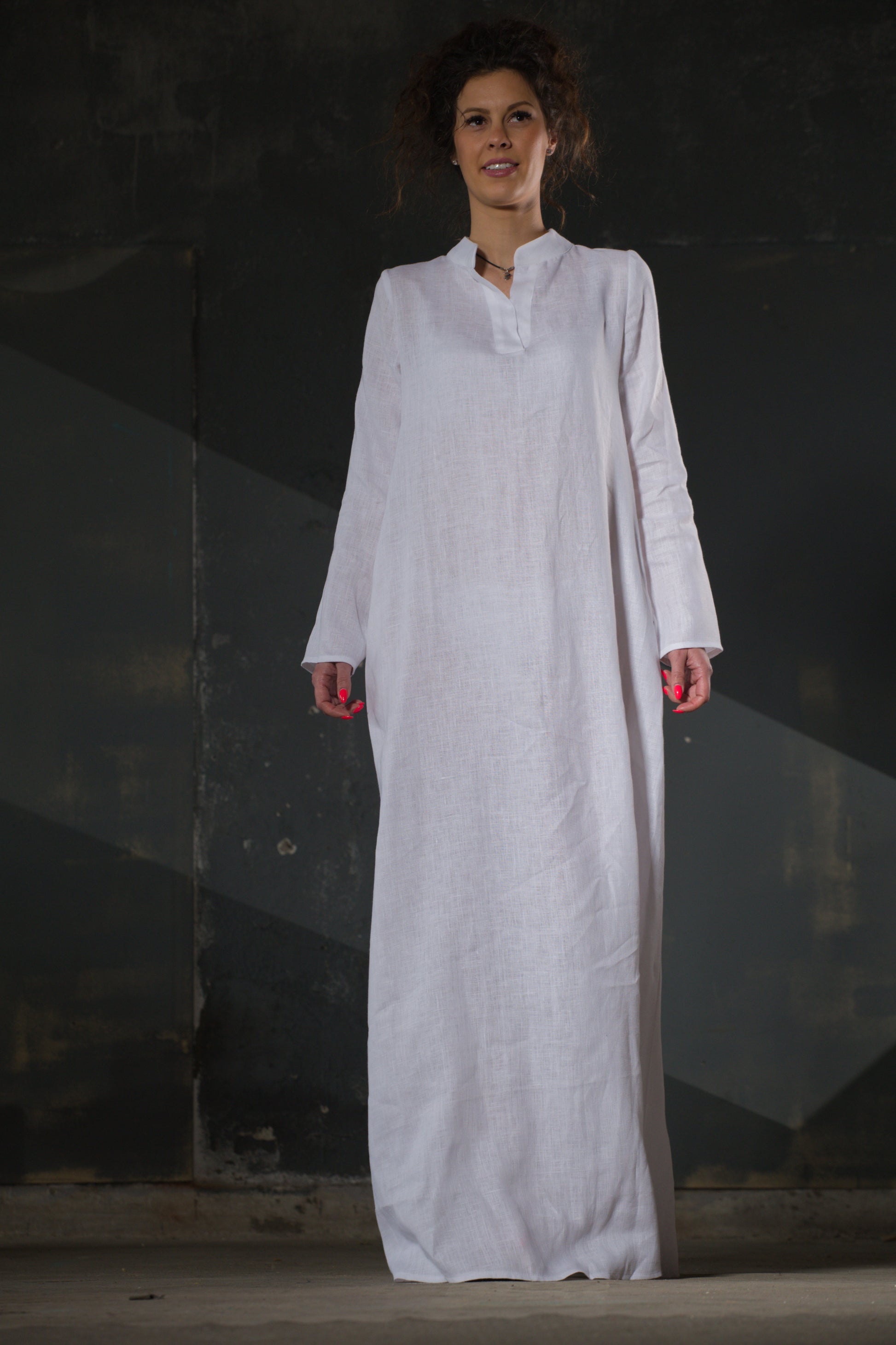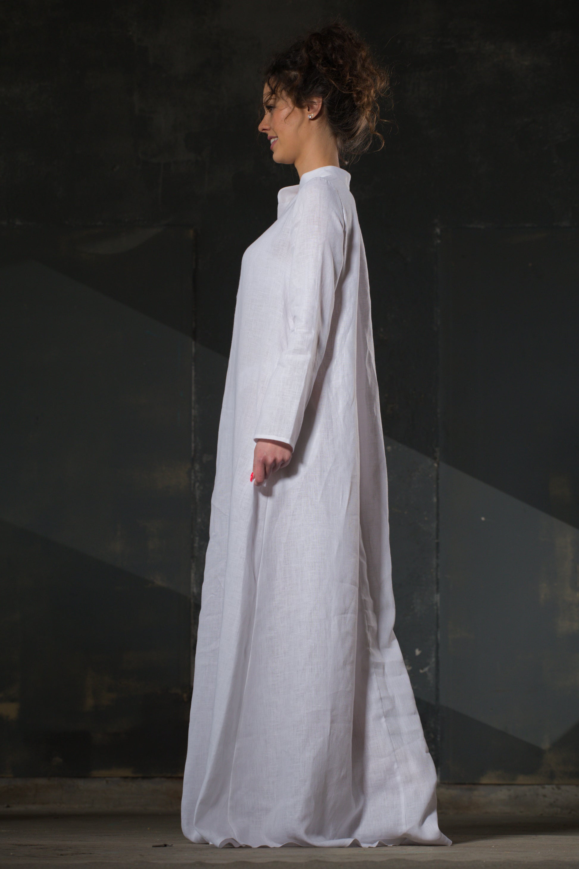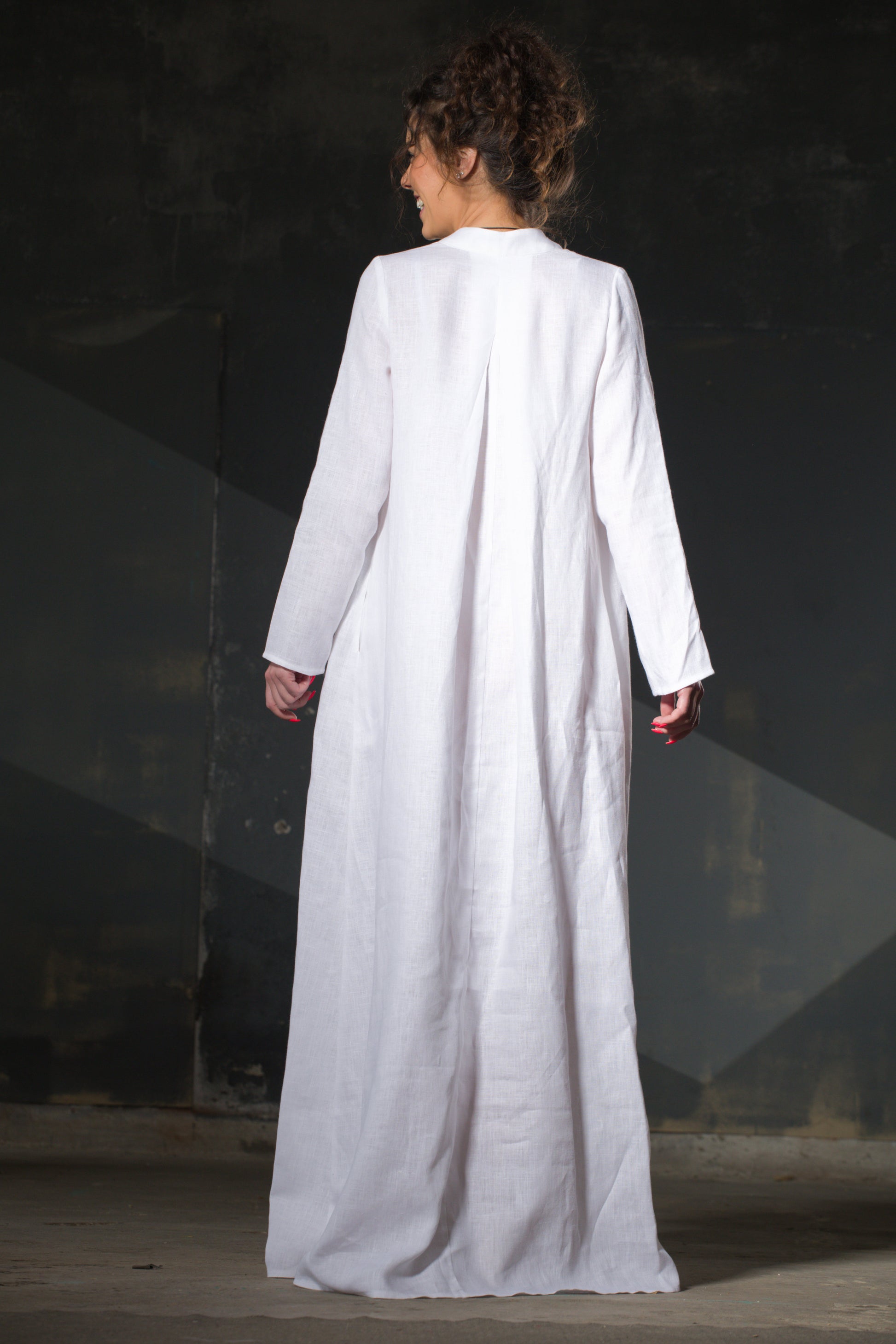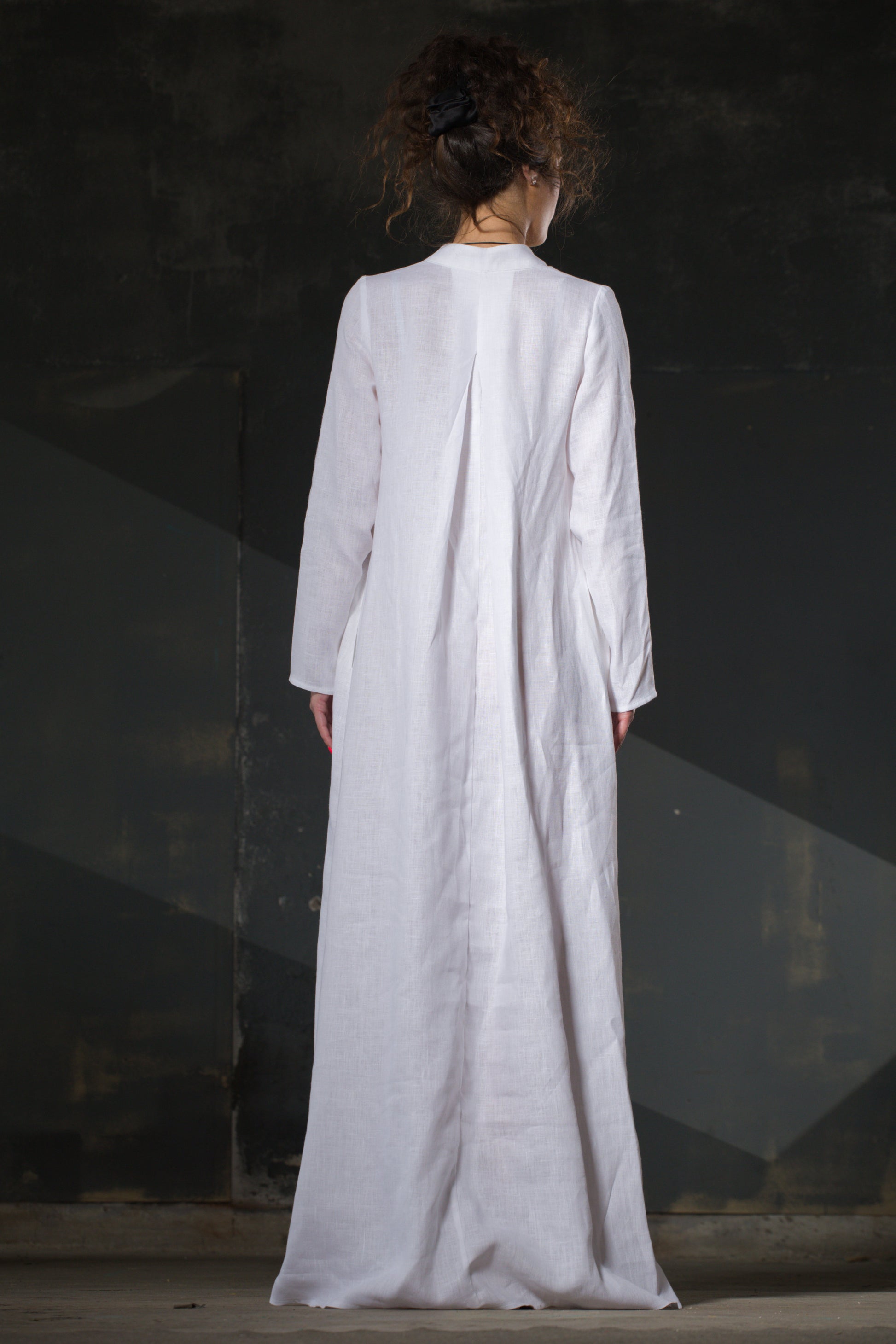 White linen, fully considered, from collar to floor. The mandarin collar keeps everything clean and intentional. A-line, long sleeves, deep pockets. Somewhere between a ceremony and a quiet Tuesday. Minimal and entirely deliberate.