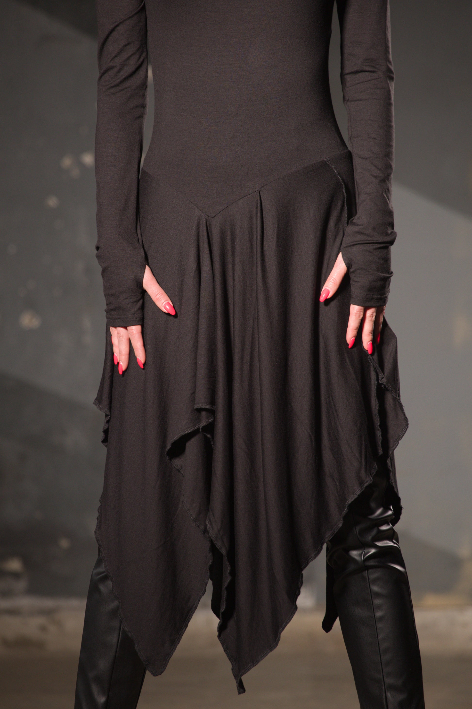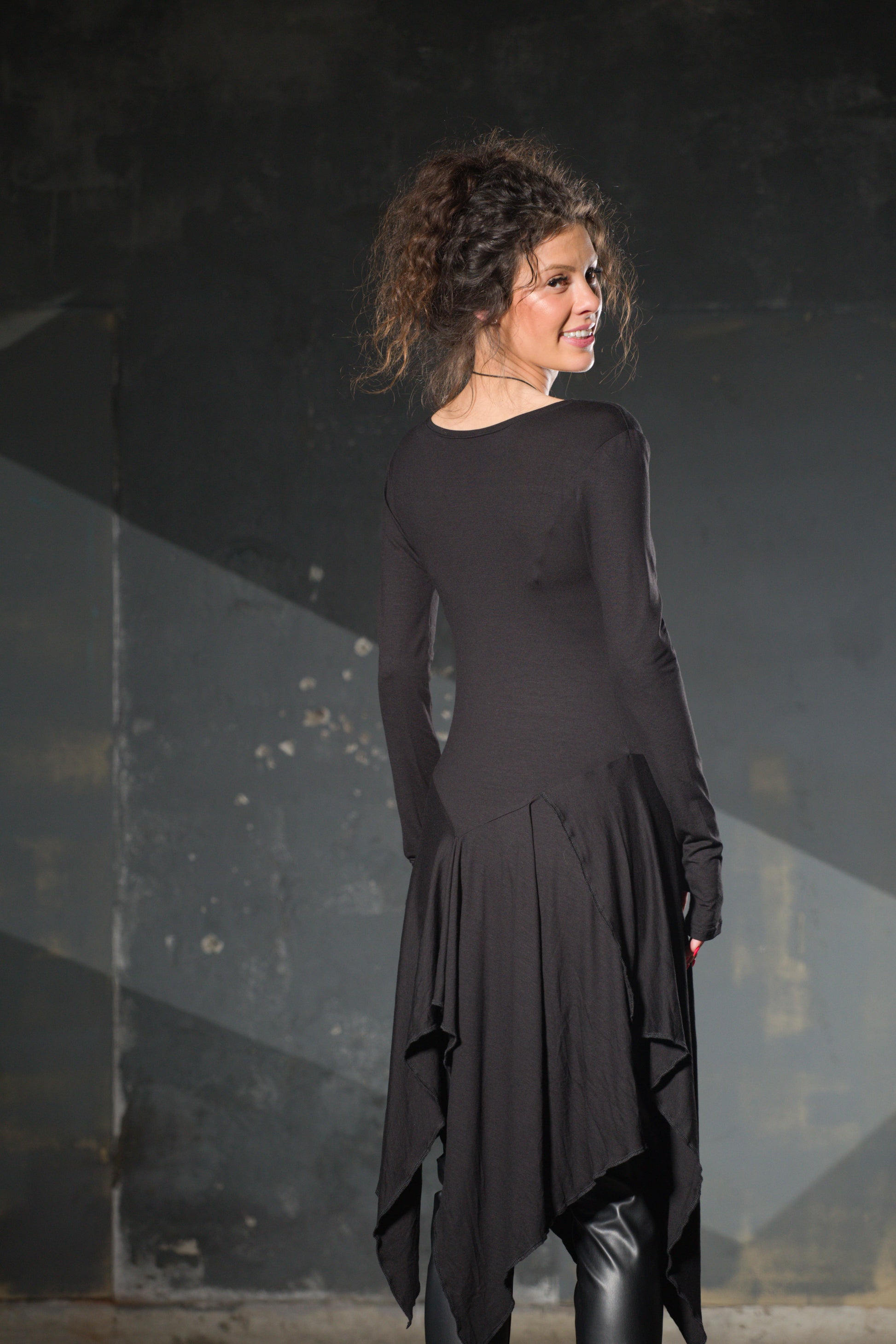Black Jersey Asymmetric Tunic — Off-Shoulder, Thumb Holes