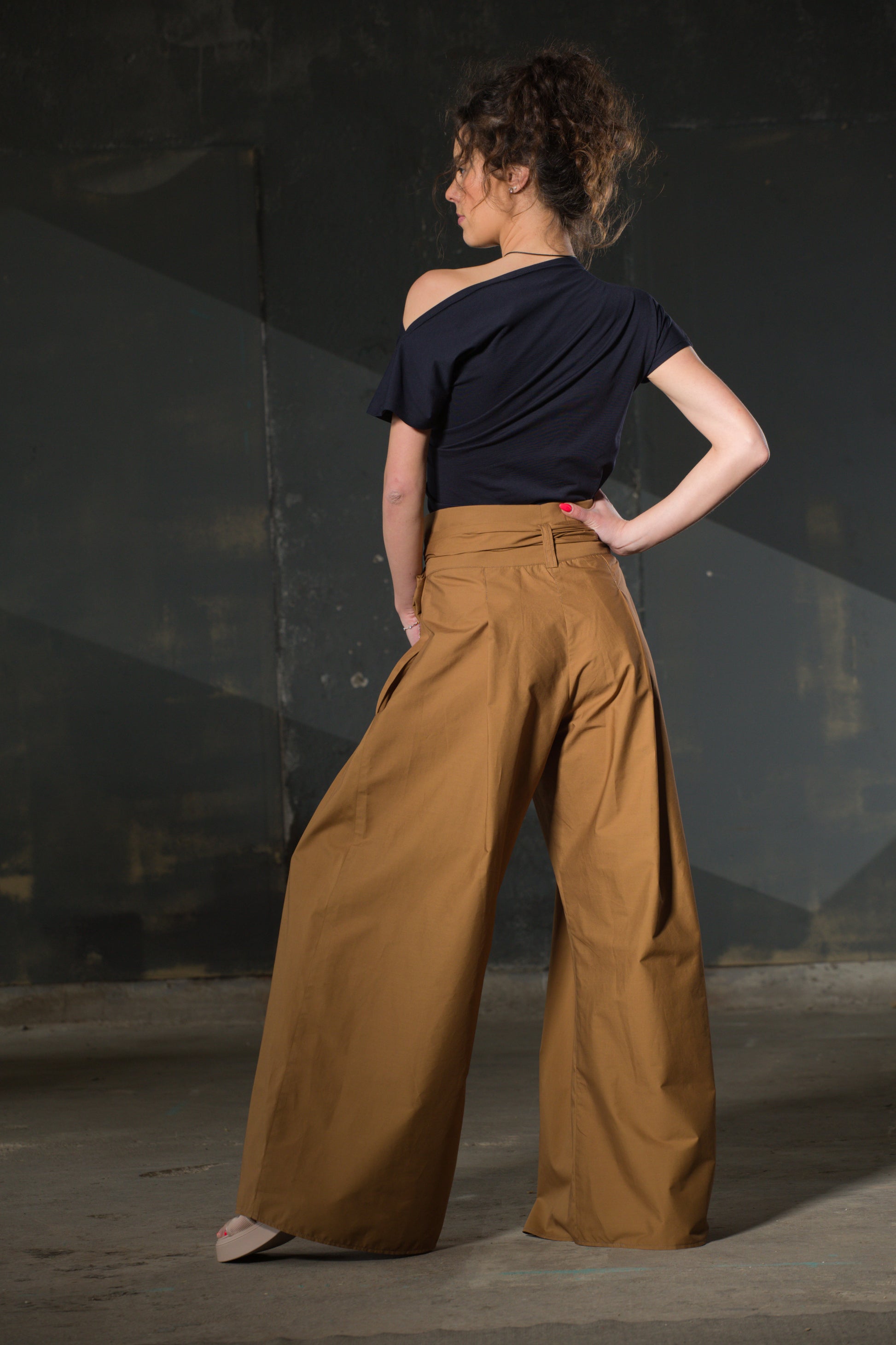 Belted at the hip, wide from there to the floor. Caramel cotton — warm and slightly structured in the way good cotton is. The kind of trousers that make a plain top look intentional. Made for the days you want presence without effort.