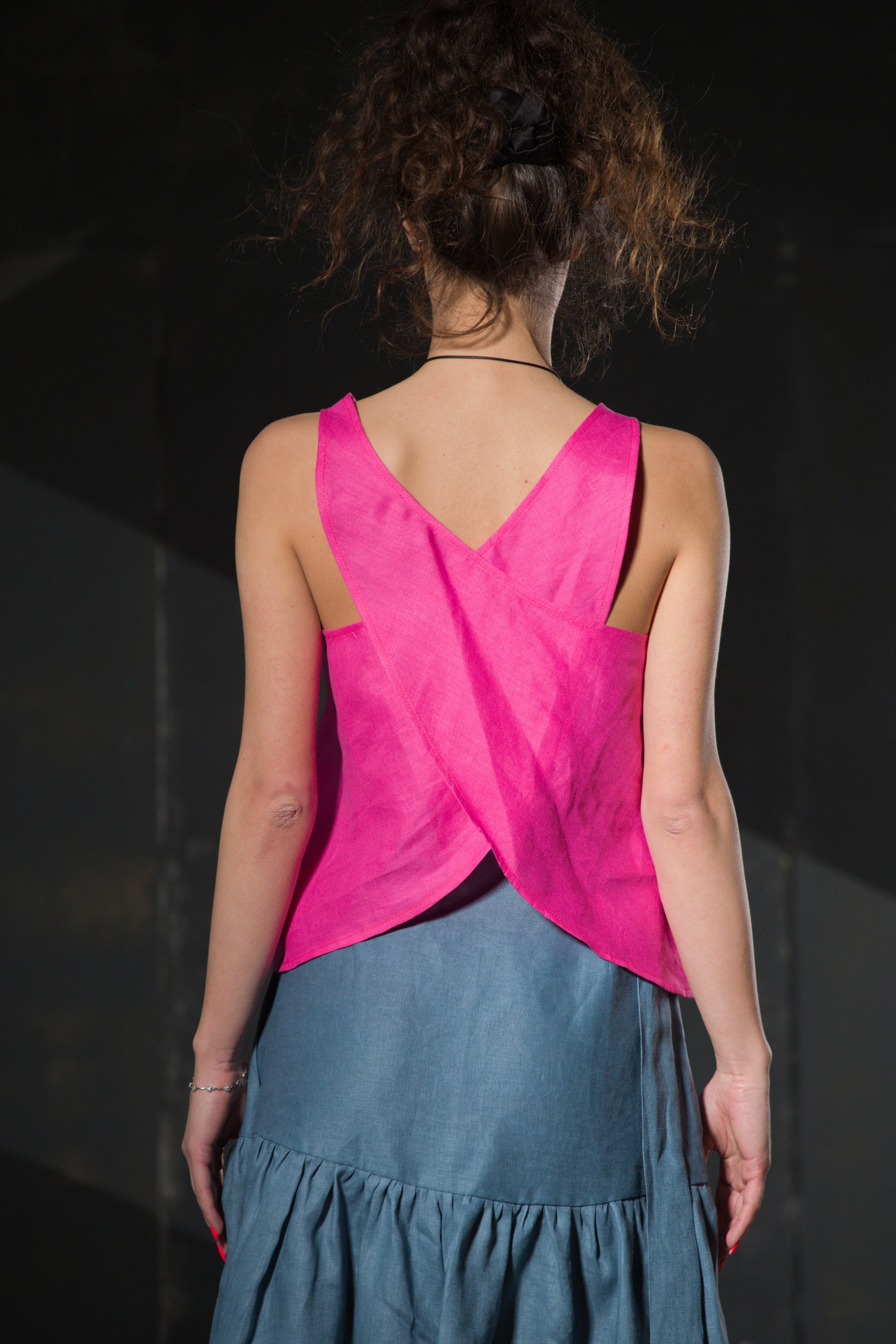 Hot pink linen with straps that cross at the back — simple geometry, striking result. Cut loose at the front, open at the back. The kind of top that looks deliberate with linen trousers and effortless with everything else.