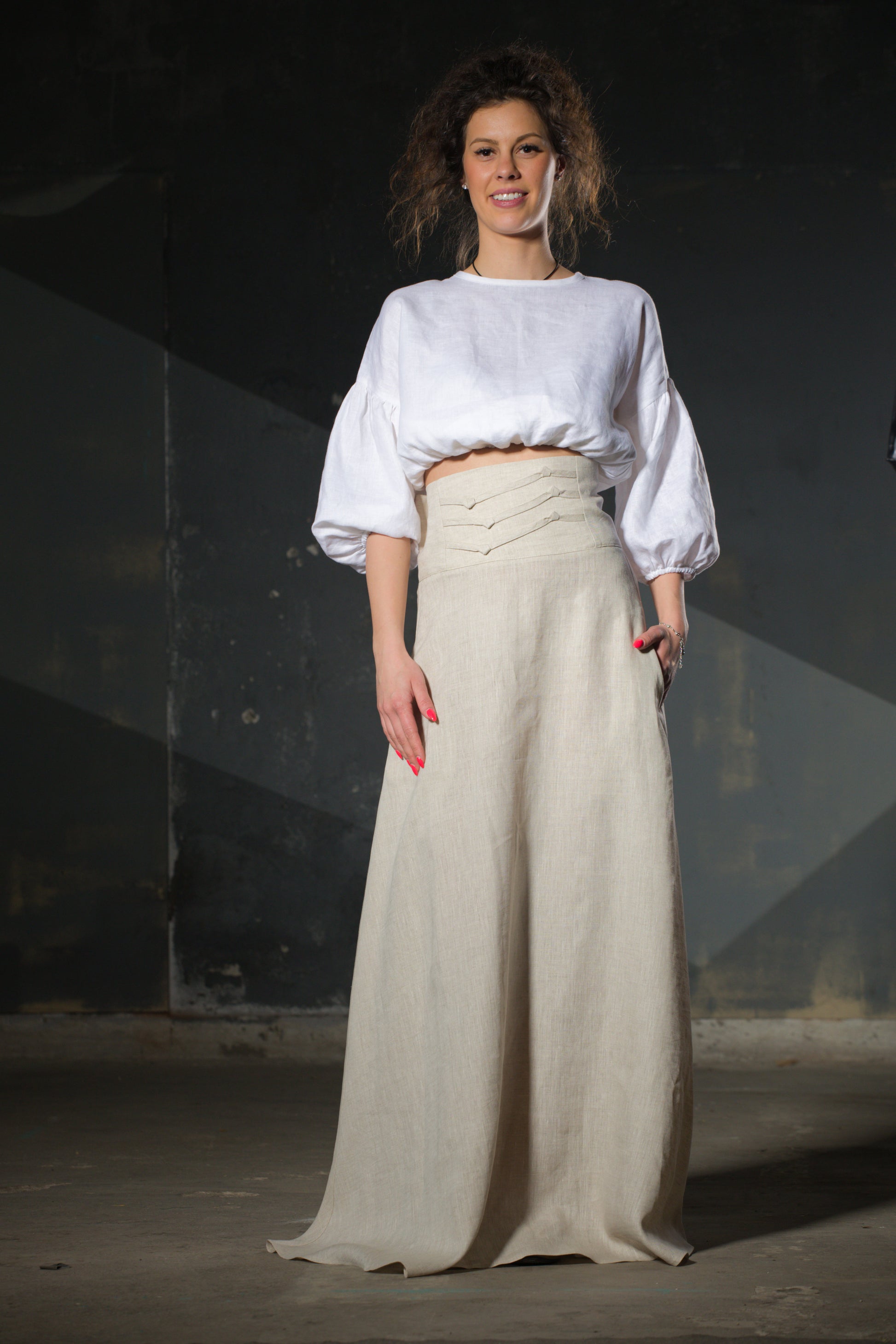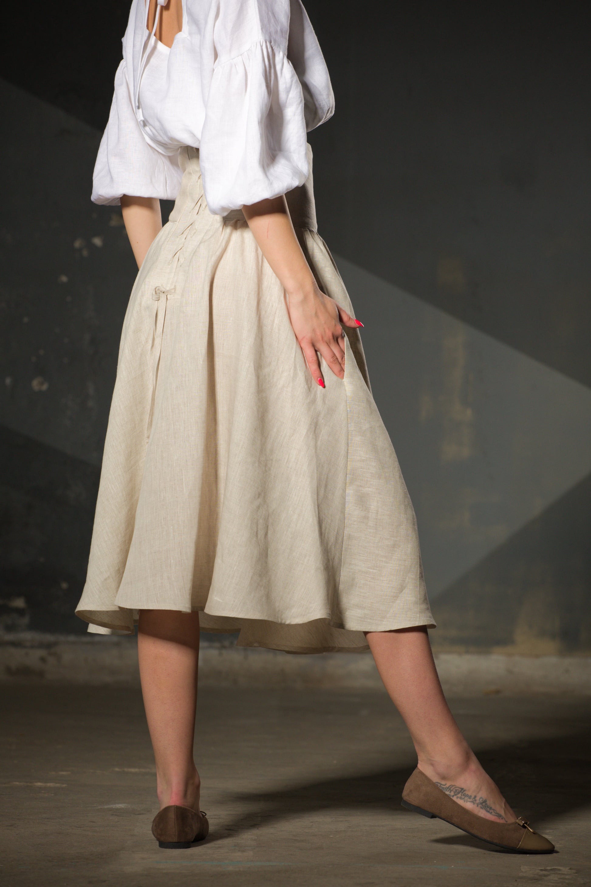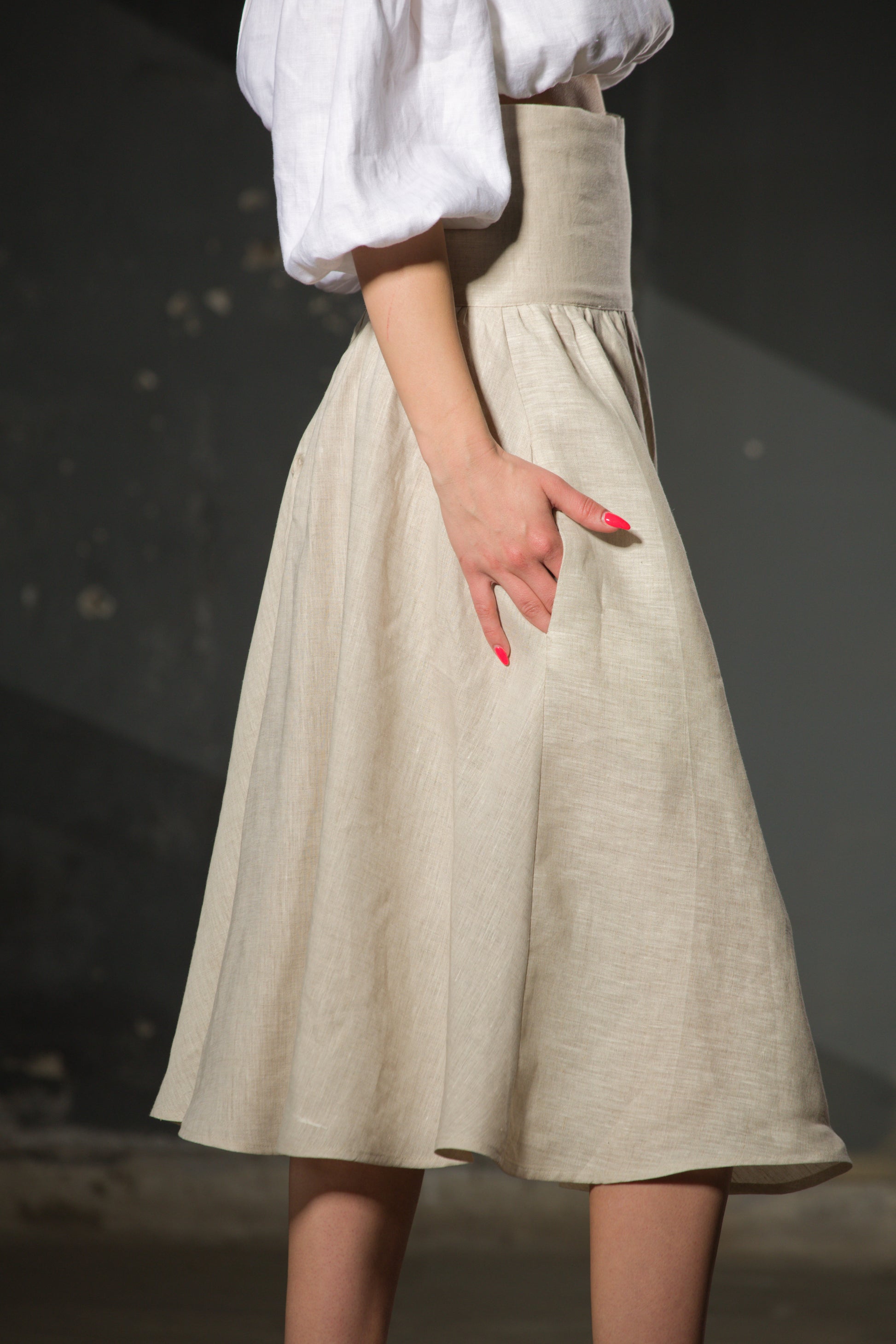 The waist is the story: high, structured, with geometric detailing at the front. Below it, natural undyed linen falls to the midi hem in a clean A-line. The skirt you keep for decades.