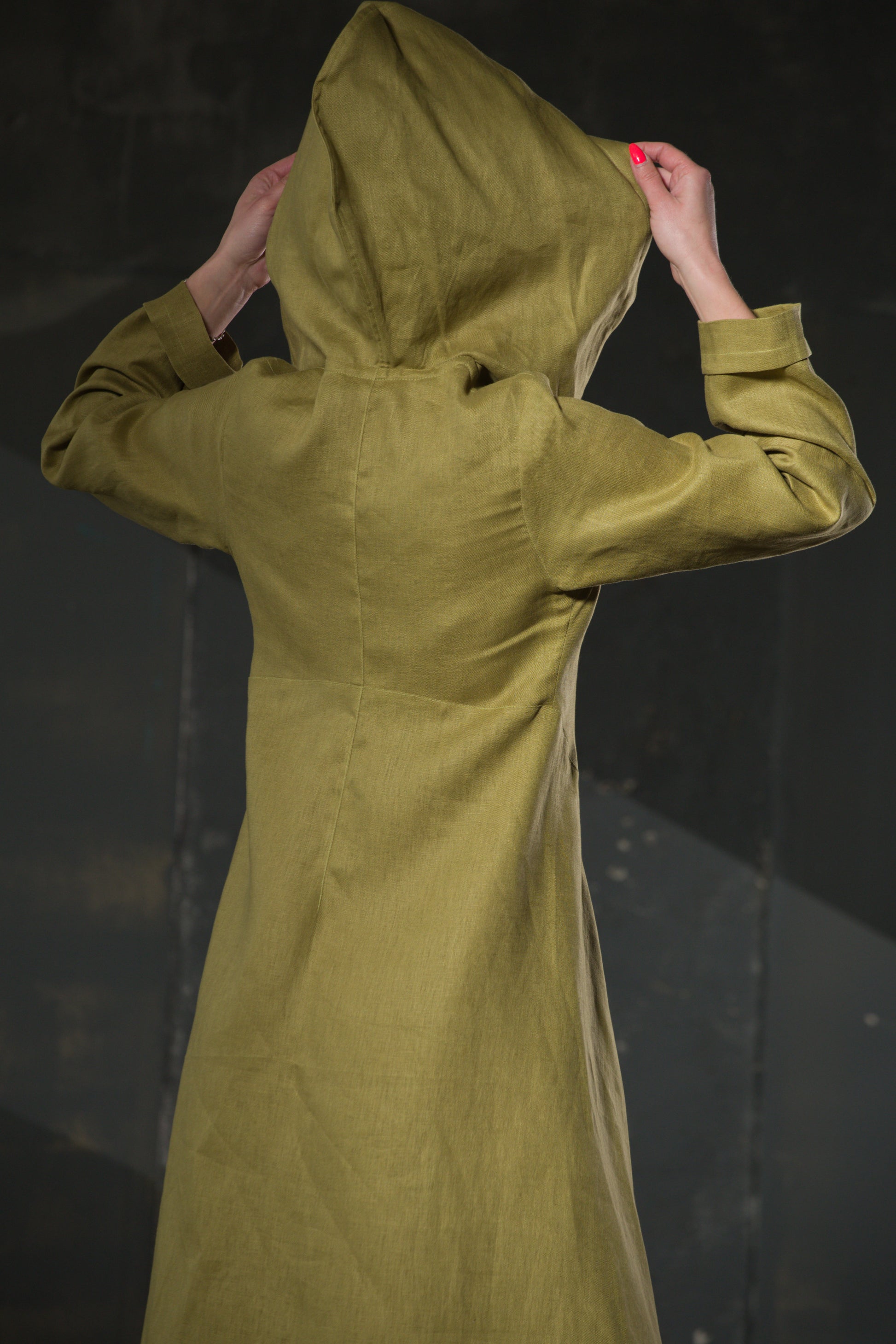 Olive Hooded Maxi Coat — Belted, Asymmetric Hem