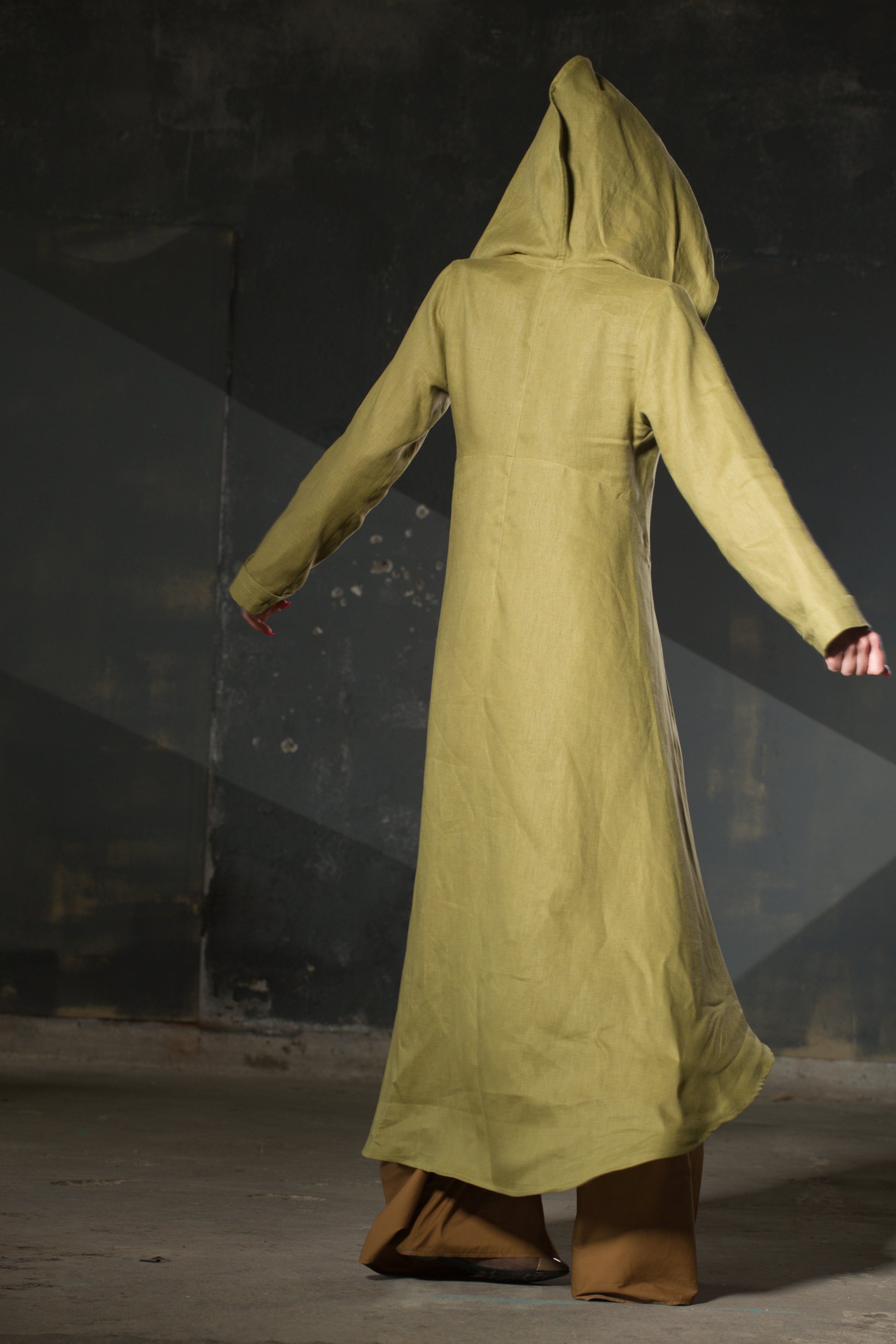 The hood is architectural. It doesn't collapse. The coat falls to an asymmetric hem, longer at the back, with a structured closure at the front and a belt that can be worn or left hanging. Olive-green, front pockets deep enough to be useful. This coat is the outfit.