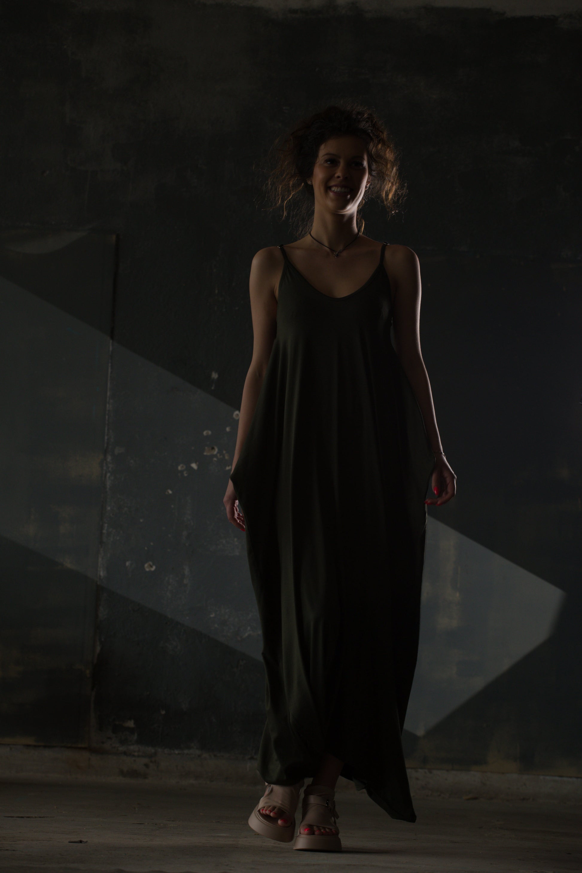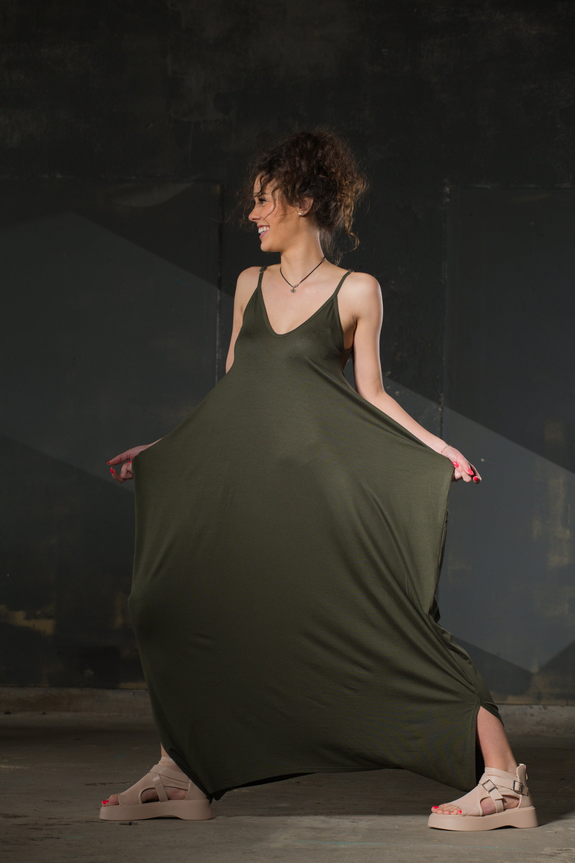 Army green jersey that pools at the floor. Two thin straps, a V that dips, fabric that hangs with complete disregard for structure. The pockets are hidden inside the drape. This is the dress you wear when the occasion calls for something that looks effortless — and is.