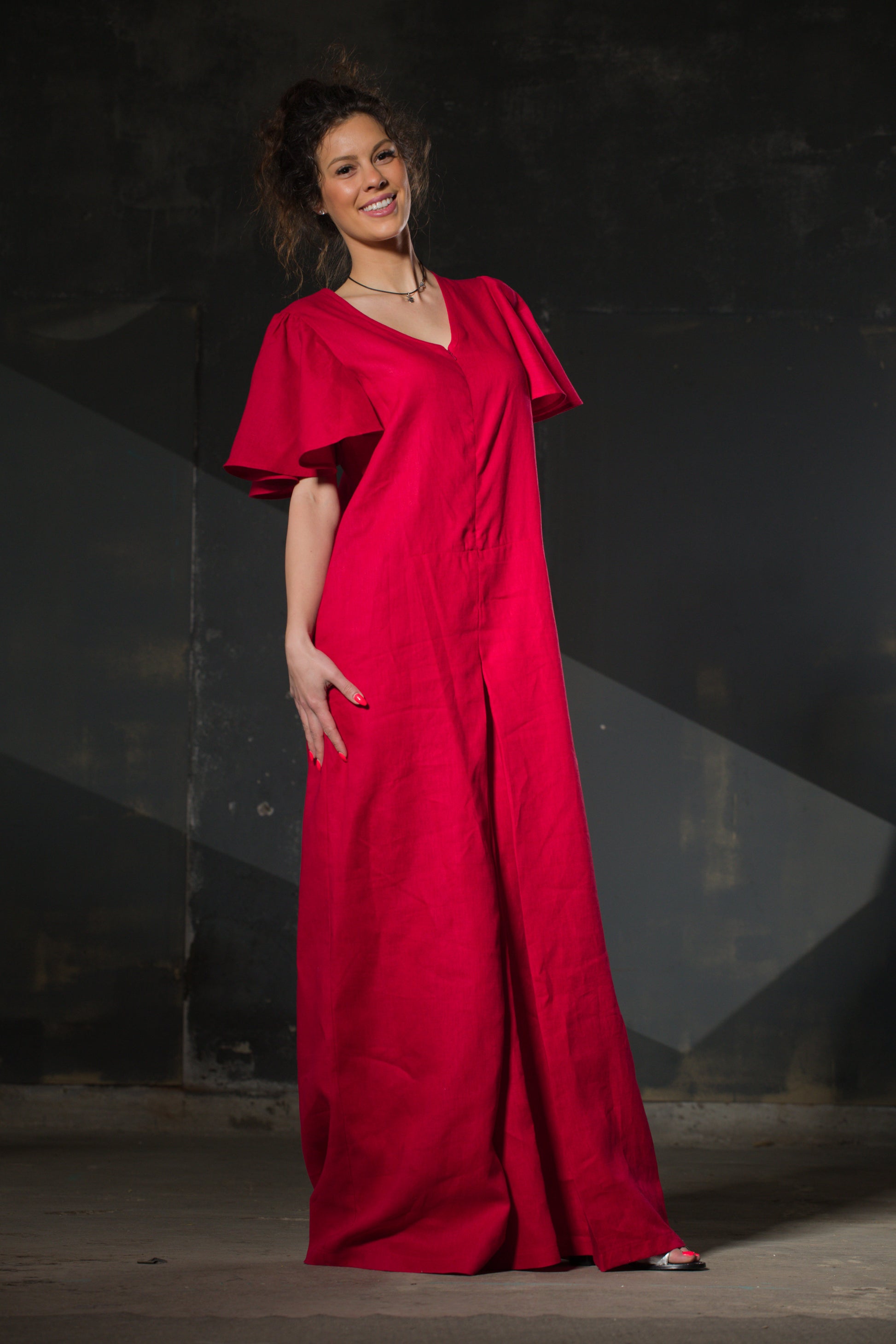 Some garments are made for standing still. This is not one of them. The butterfly sleeves catch the light as you move — fluid, unhurried, dramatic without effort. Cut in crimson linen with palazzo legs and a front slit, it wears like something borrowed from a poem you once read. Belted at the waist or left to fall free. Yours completely.