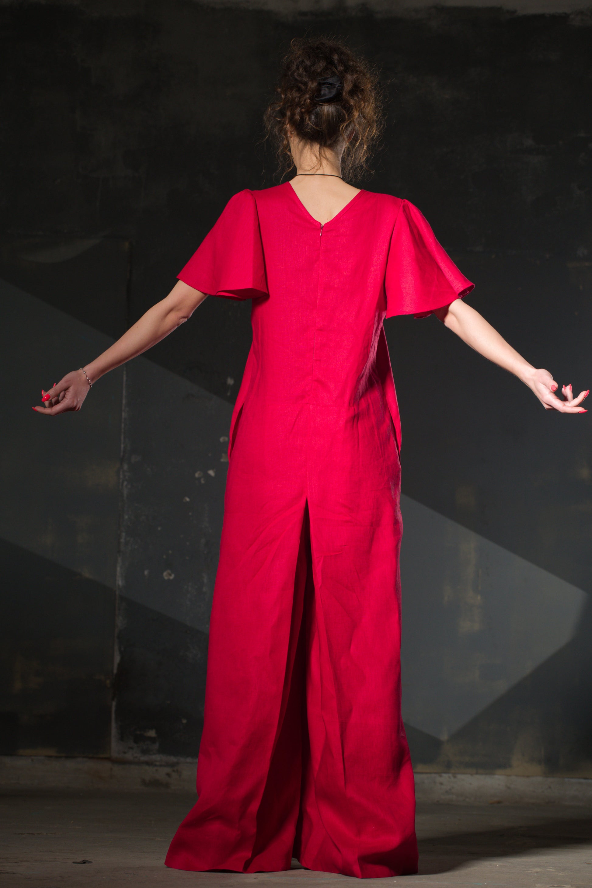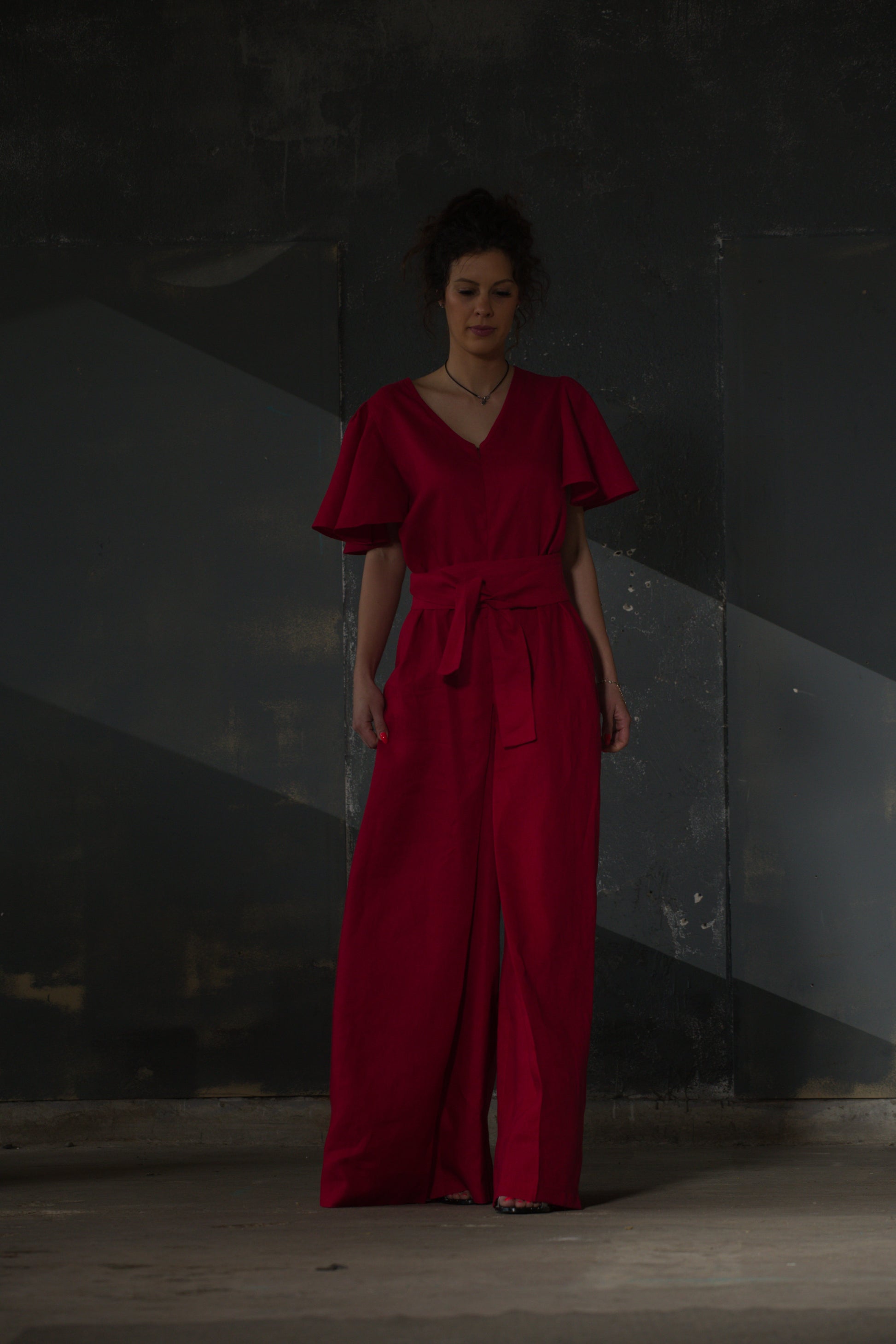 Red Linen Jumpsuit — Butterfly Sleeves, Palazzo Legs