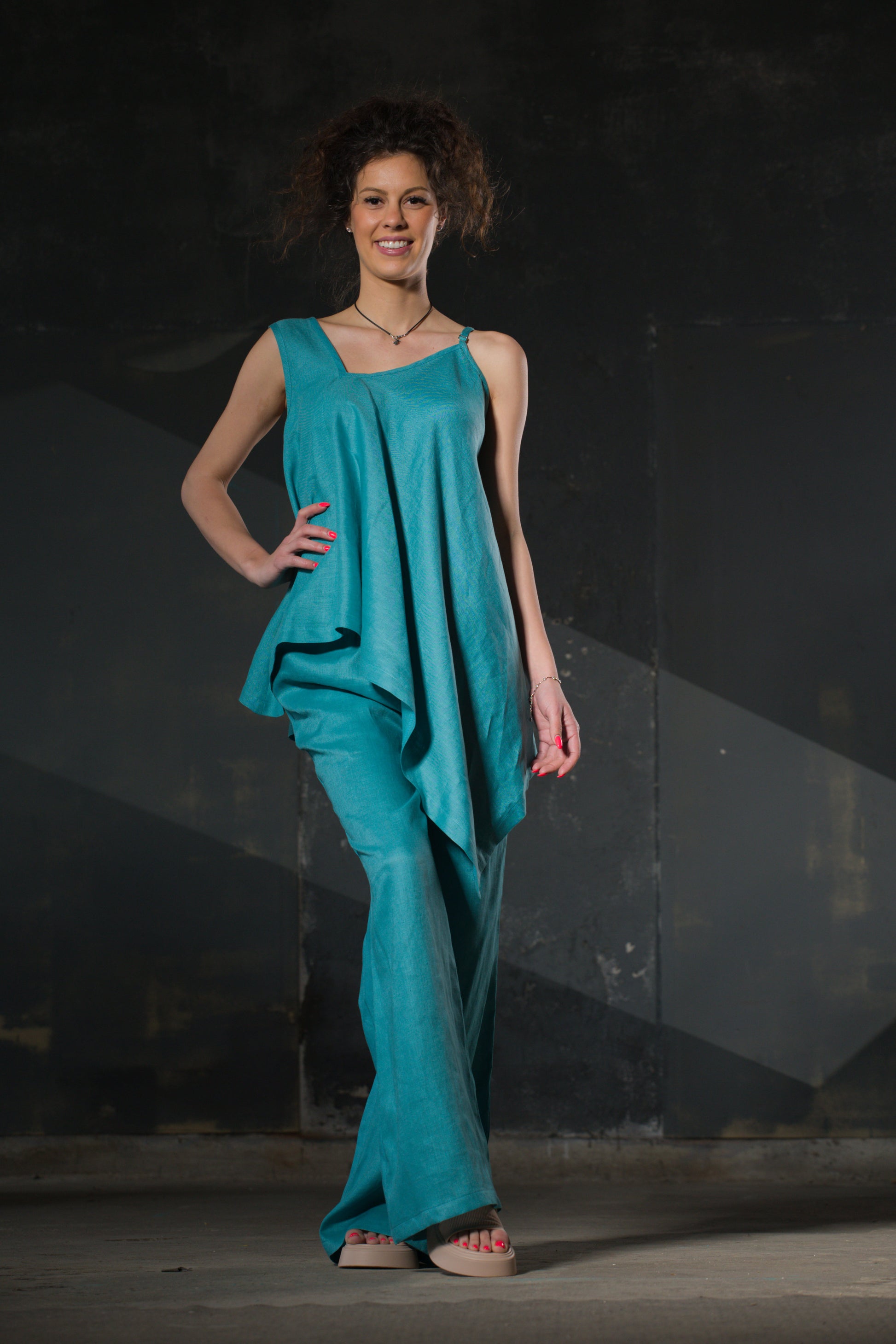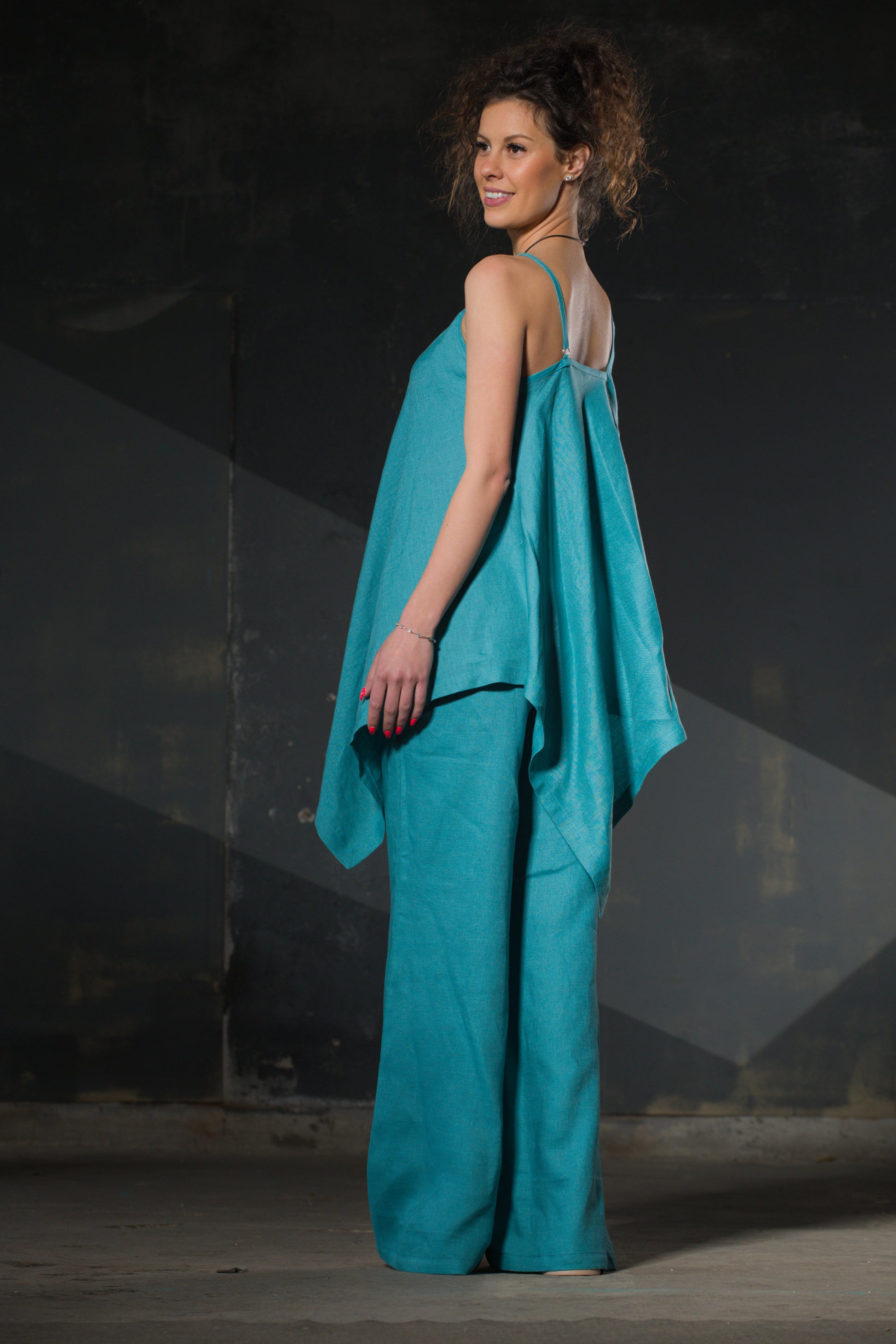 One strap thick, one thin. The asymmetry is the design — nothing to resolve, just a top that drapes differently from every angle. Turquoise linen, loose fit. Pairs with the wide-leg trousers as a set, or wears with anything else you trust.