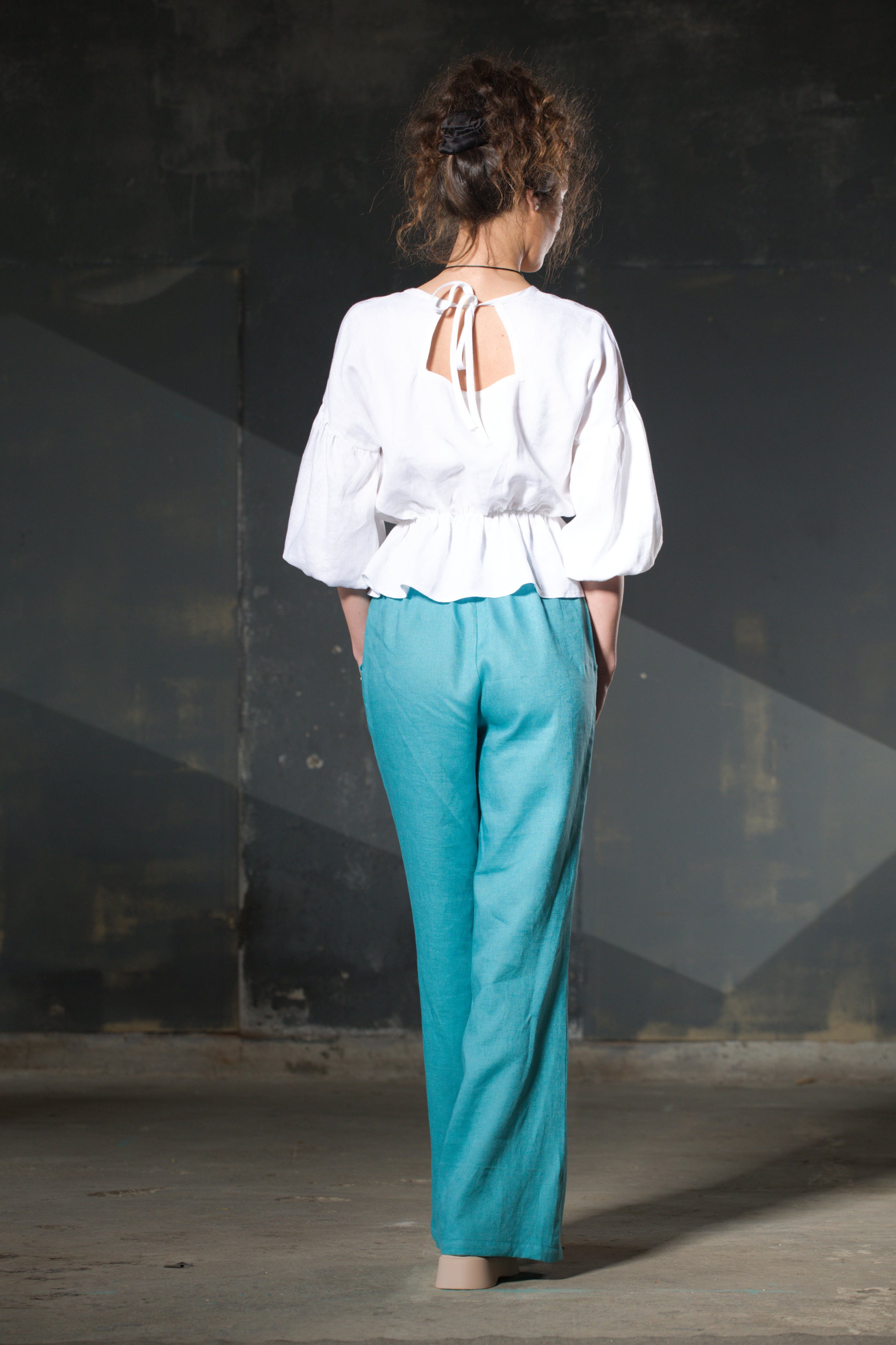 Wide-leg linen that moves like a skirt when you walk. The pockets are real. The waist sits easy. Turquoise that reads differently in morning light than at evening — both versions worth wearing. Sold alone or as a set with the asymmetric cami top.