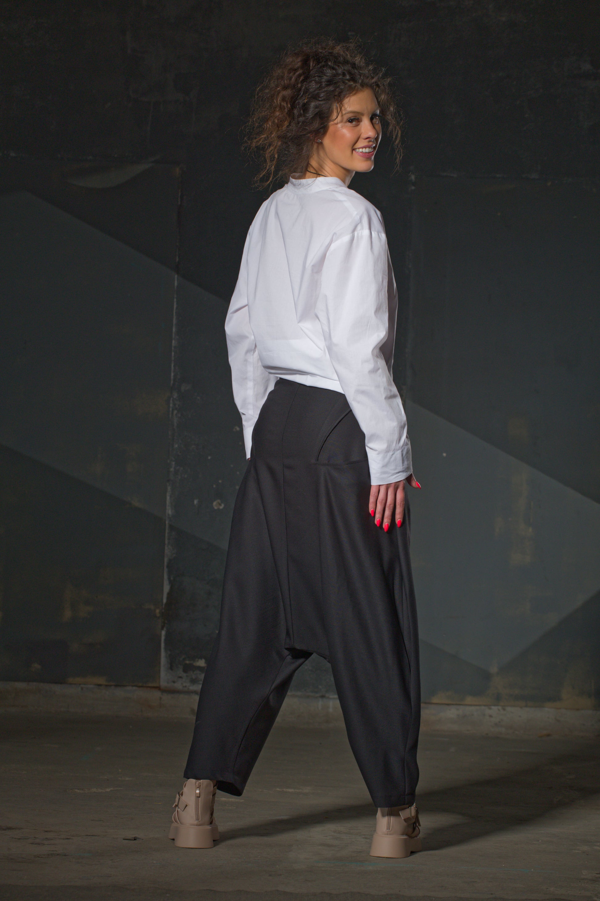 The mandarin collar, dropped shoulder, and asymmetric hem make this shirt four decisions packed into one. White cotton, long-sleeved, clean lean silhouette. Wear it tucked, worn out, or half-tucked — it looks considered regardless.